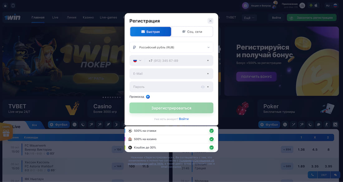 Букмекерская контора 1 Вин предлагает несколько вариантов создания учетной записи. Выбирайте наиболее удобный для вас и регистрируйте аккаунт, следуя рекомендациям:
